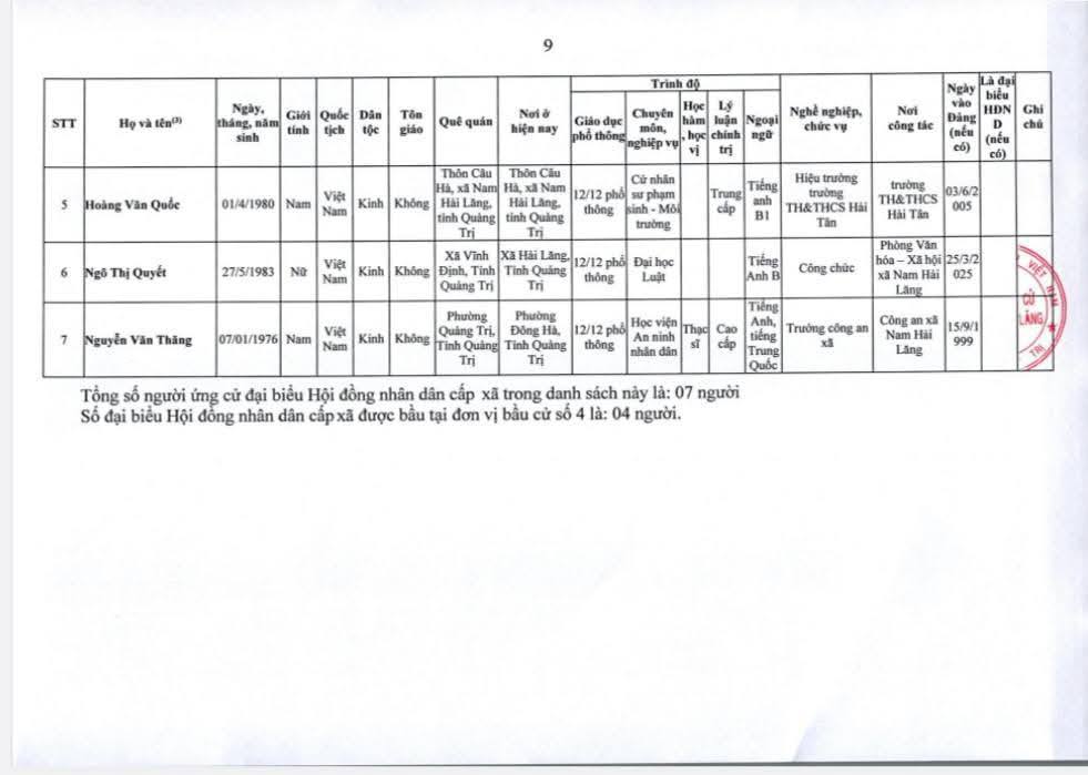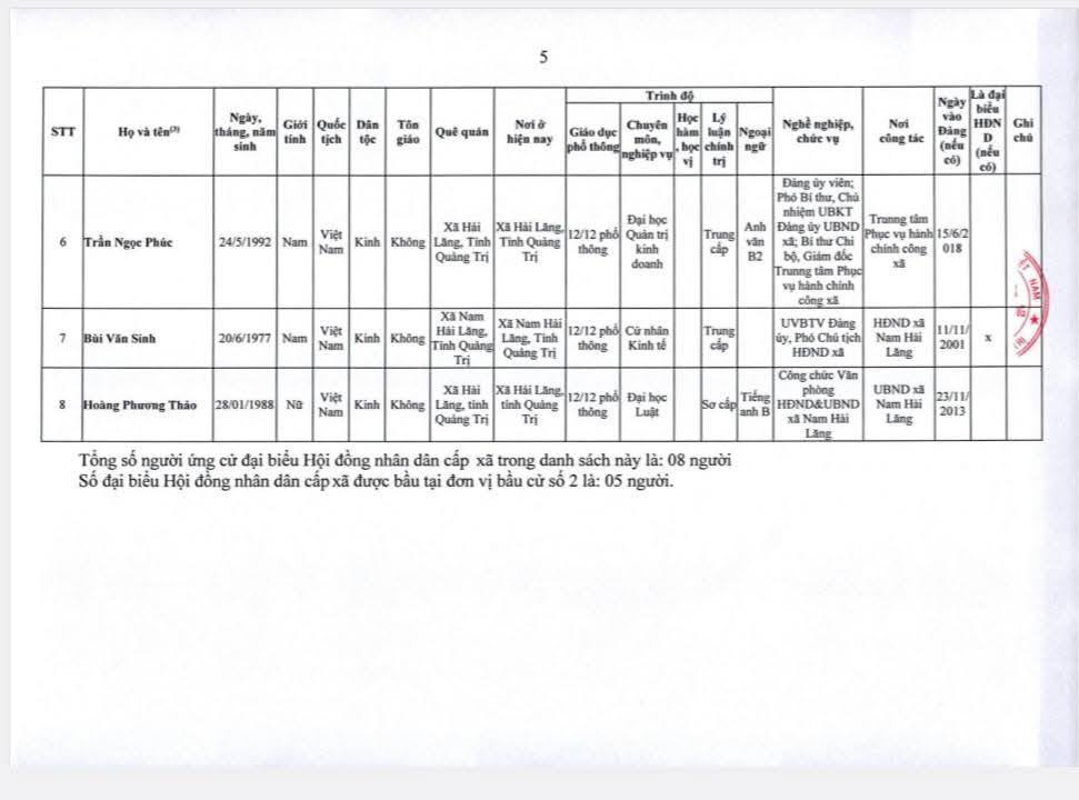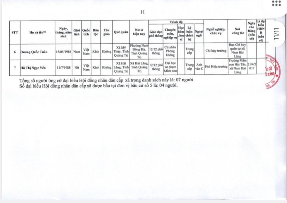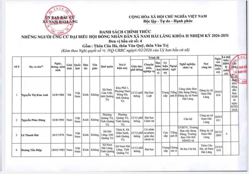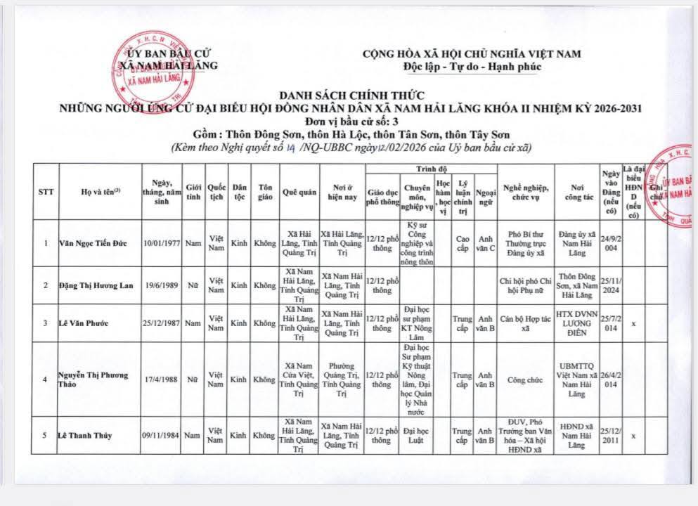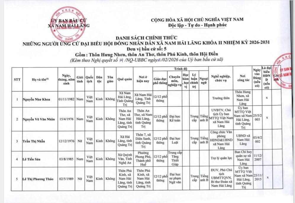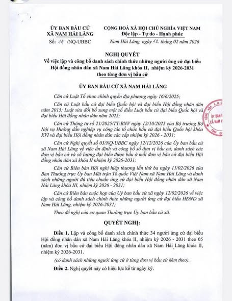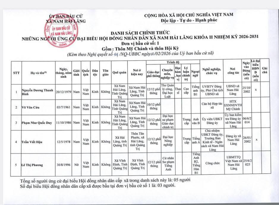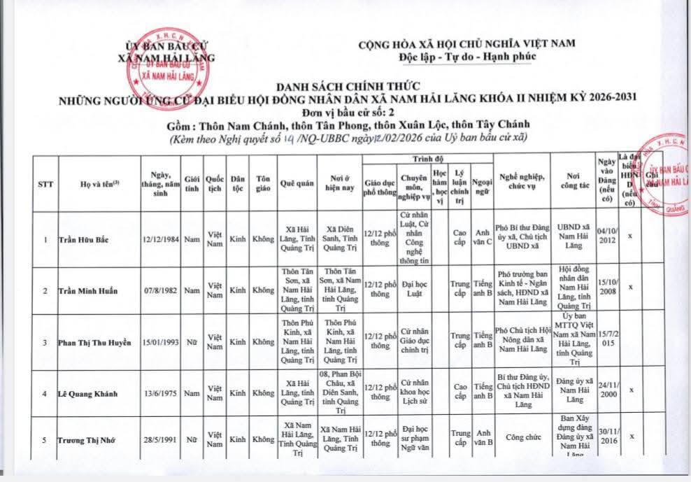 Công bố danh sách chính thức những người ứng cử đại biểu Hội đồng nhân dân xã Nam Hải Lăng nhiệm kỳ 2026–2031 theo từng đơn vị bầu cử.