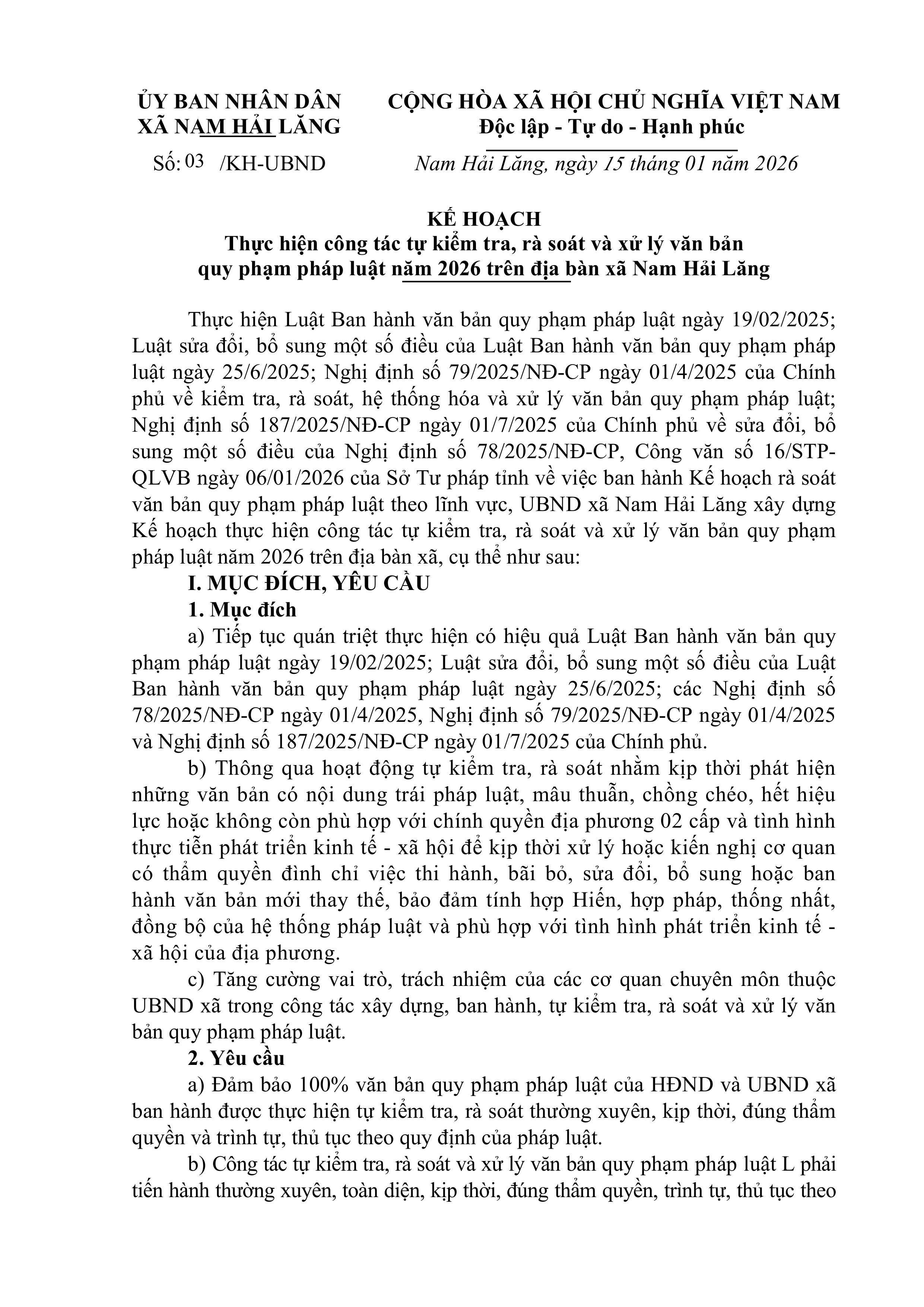 Kế hoạch thực hiện công tác tự kiểm tra, rà soát và xử lý văn bản quy phạm pháp luật năm 2026 trên địa bàn xã Nam Hải Lăng