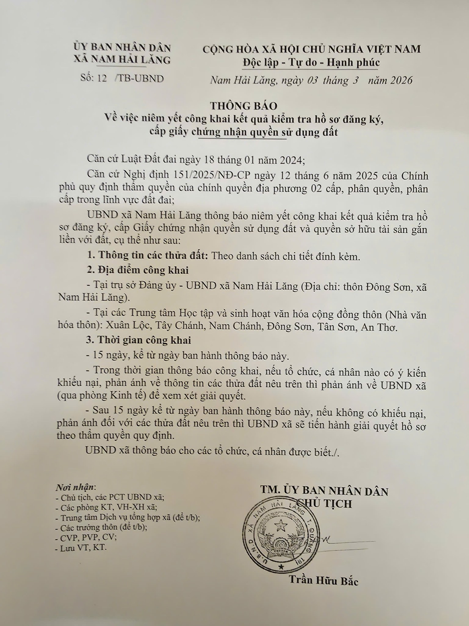 THÔNG BÁO: Về việc niêm yết công khai kết quả kiểm tra hồ sơ đăng ký, cấp giấy chứng nhận quyền sử dụng đất.