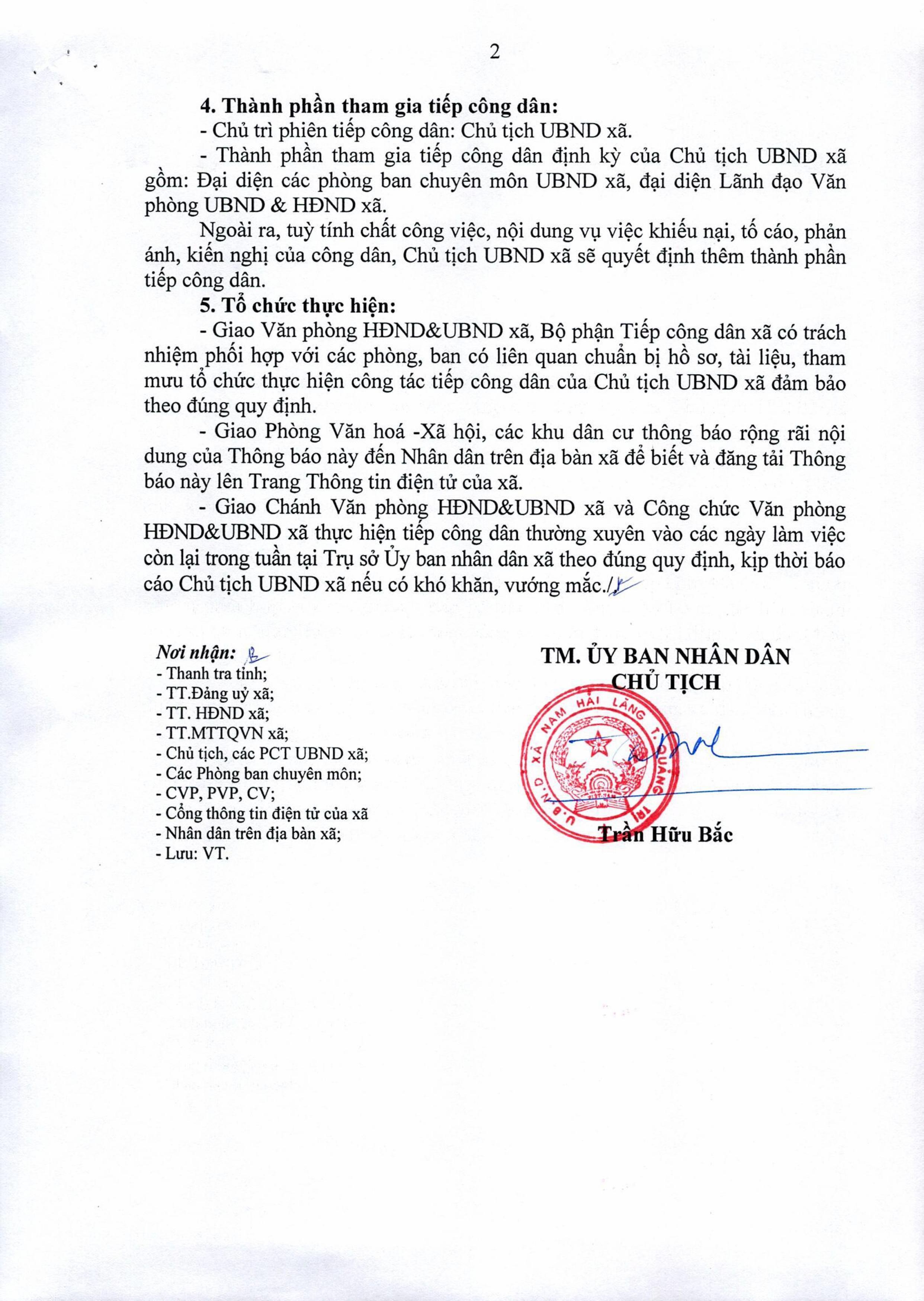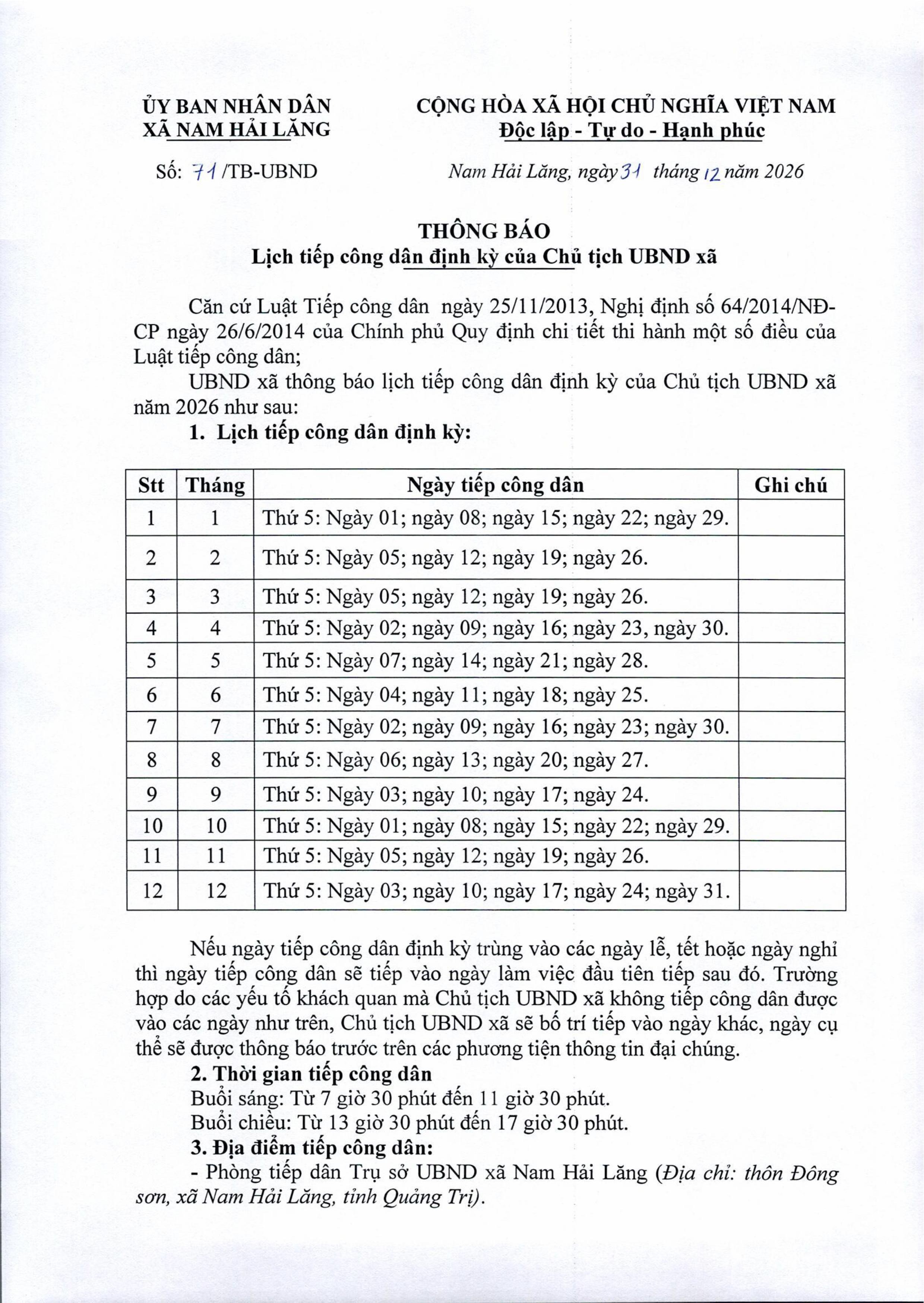 Lịch tiếp công dân của CT. UBND xã Nam Hải Lăng năm 2026