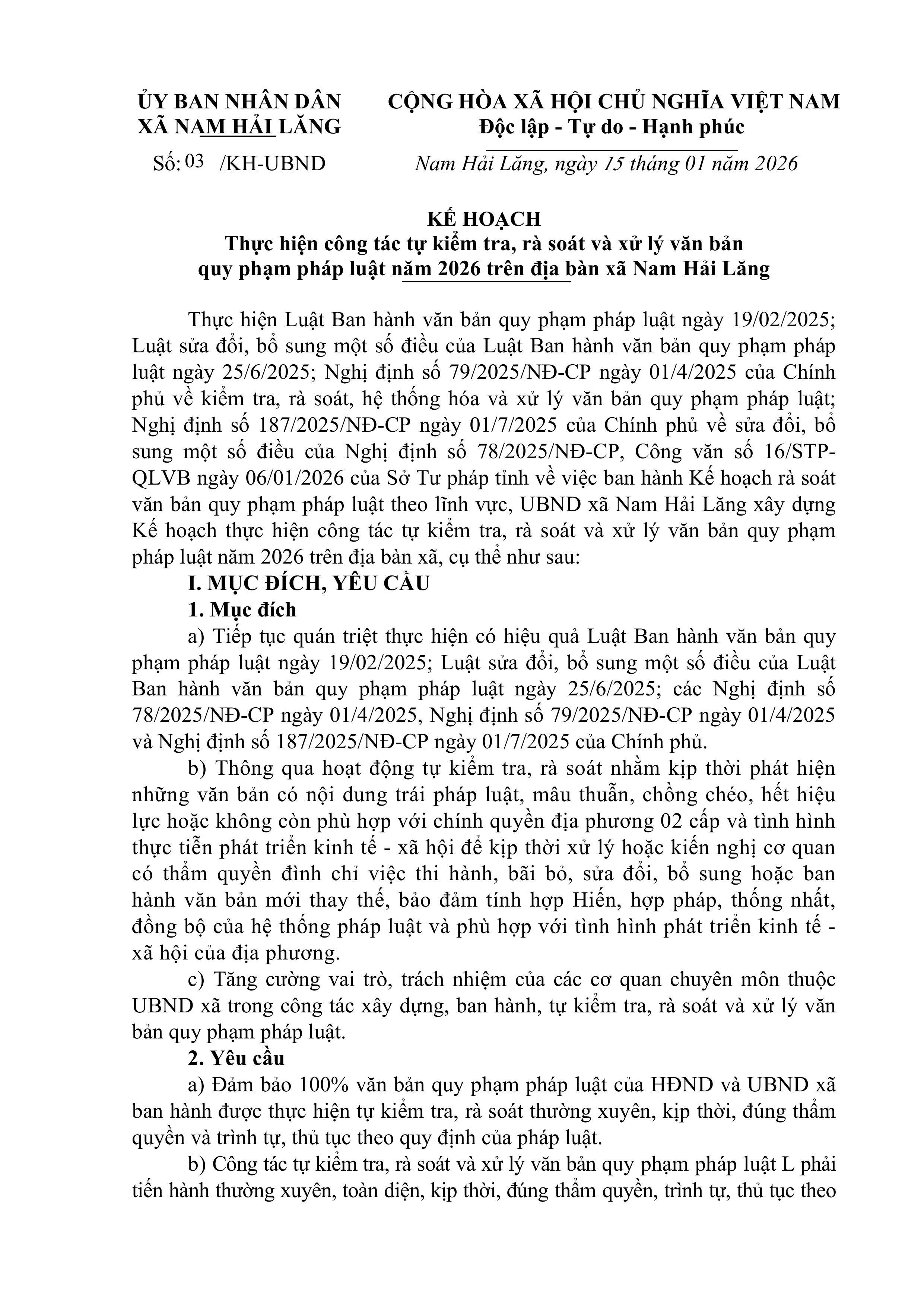 Kế hoạch thực hiện công tác tự kiểm tra, rà soát và xử lý văn bản quy phạm pháp luật năm 2026 trên địa bàn xã Nam Hải Lăng